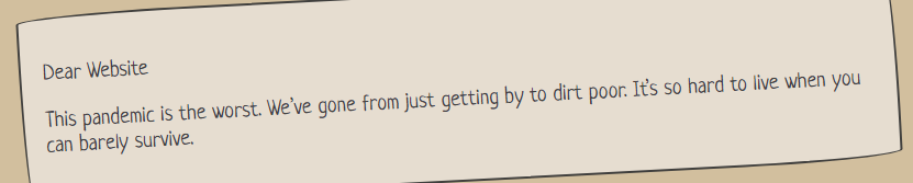 这一点创建者就给大家起了个头,在网页说明中,创作者说了这样一句话“It’s been a rough few months(这几个月情况很艰难)”。鉴于网站发布于疫情开始在全球蔓延的时期,这句话的所指不言而喻。