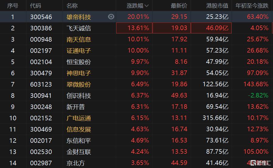 格隆汇1月24日丨数字货币板块走强,其中雄帝科技涨停,飞天诚信涨13%,南天信息、恒宝股份、证通电子涨停,神思电子涨9%,翠微股份、创识科技、新开普涨6%、广电运通涨6%。