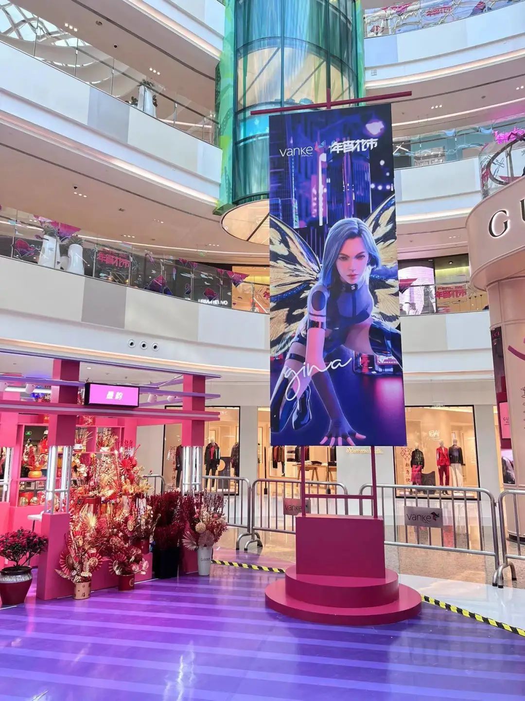 上海七宝万科广场就这么干了。春节前的年宵花市,虚拟人 Gina 就来帮商场吸引客流。商场给出的宣传文案就是「走出元宇宙,和你现实碰一碰」,也算踩中了今年最热的热点了,虚拟人+元宇宙,直接冲到了潮流的最前沿。