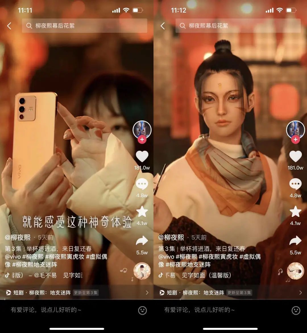 目前在中国虚拟人阵营中列属第一梯队的柳夜熙就在春节前发了第三集的短视频,视频看上去和春节相关度非常高。这期视频中不仅有传统的投壶游戏,还有大家一起吃团圆饭的场景,而这次柳夜熙追踪的人名叫「寅」,也和虎年的生肖相呼应。