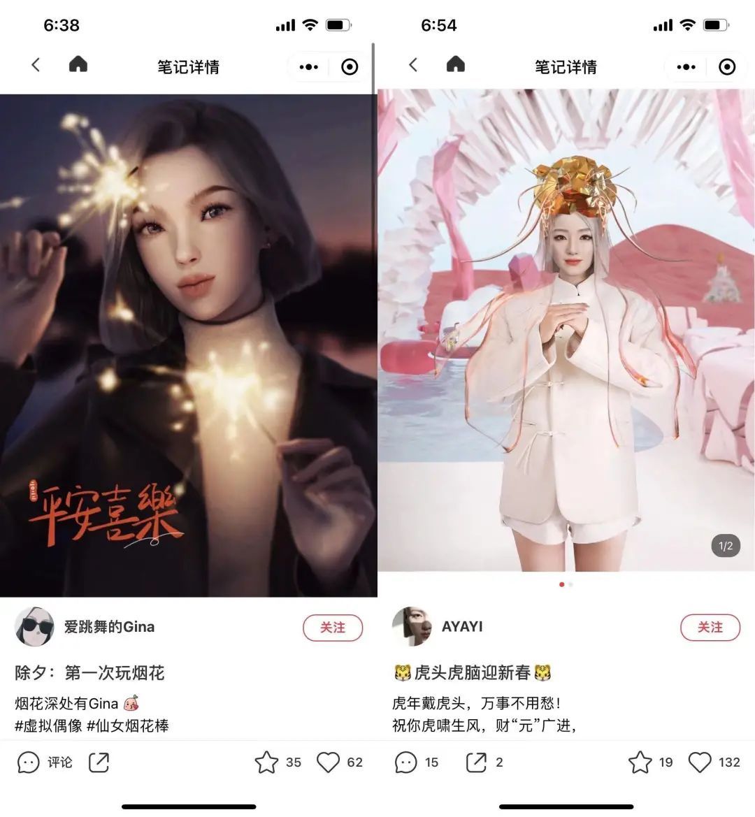 前面提到跑商务的 Gina 和靠着一张神颜证件照爆火的虚拟人 AYAYI 也在春节前营业了,一个除夕夜放烟火,另一个虎头虎脑迎新春。