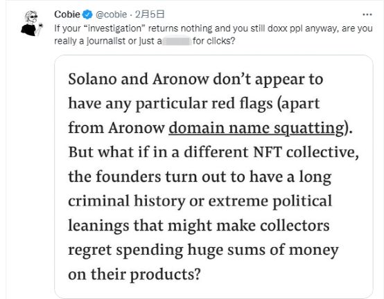 致力投资Web3加密领域的VC机构6th Man Ventures投资人 Mike表示,这两位创始人选择用匿名的方式,在不依赖自己身份的情况下创造了美妙的事物,但记者却对他们进行“人肉”,这种行为太丢人了。
