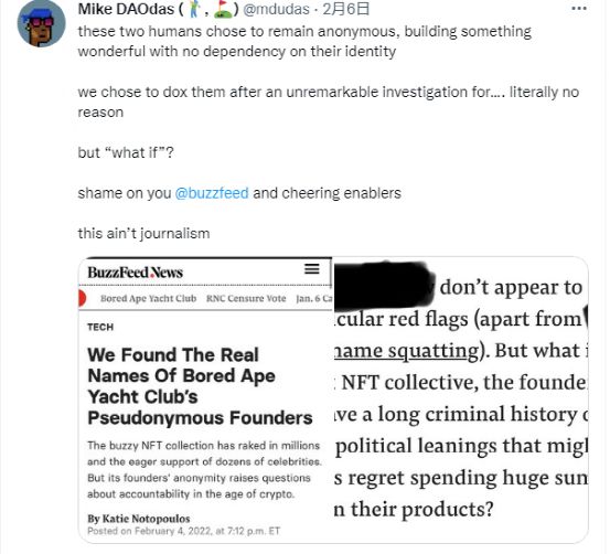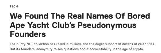 而随着产品和公司资产价值的飙升,以无聊猿为代表的NFT项目创始人们的身份也成为社会关注的话题,正如BuzzFeed News报道中指出的那样,面对一个价值数十亿美元的公司,如果不知道经营者是谁,又该如何追究他们的责任呢?
