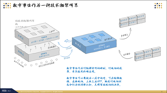 这就是数字孪生作为一种技术框架体系,作为数字化工业应用架构的中间件的意义:下启物联数据,连接现场,上承工业APP,输送对现场状态和行为的洞察认知,支撑管控现场的决策。