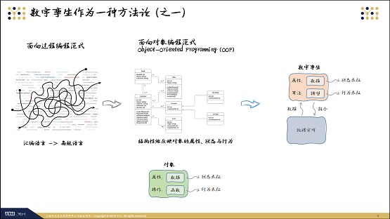 因此,作为方法论,面向对象编程范式可以为数字孪生的设计所借鉴和引用。这就是为什么我在两年多前提出数字孪生,首先是一种方法论的观点。