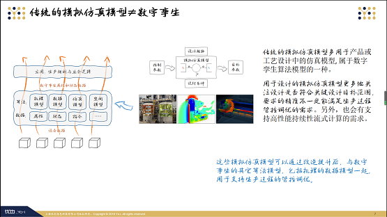 综合而言,模拟仿真是数字孪生的一个重要支撑技术,设计过程中的仿真模型是数字孪生算法模型的一个重要组成部分,但是不等同于数字孪生本身。数字孪生用于生产运营过程管控和优化的模型,一般而言,要么要对设计仿真模型进行改造提升,要么利用机理模型或数字模型建立新的算法模型。