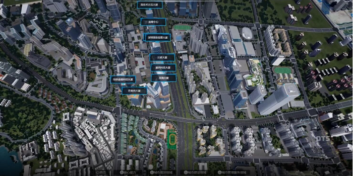 以腾讯城市数字孪生技术创造的深圳市南山区为例,我们可以清晰地看到区域内的建筑物、街道、公园等所有元素,以及实时的路面交通状况、建筑物内的状况。操作人员可以站在上帝视角,自由地切换观看角度、区域,进行放大、缩小、拉近等查看。