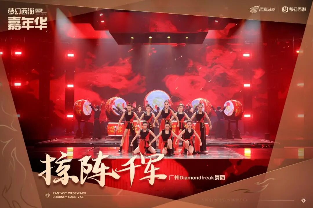 之后的表演也进一步围绕“长安”展开,舞蹈《掠阵千军》中,激昂的鼓声好似万马奔腾,仿若古今侠士跨越时间而来,在繁盛的长安城集结出征、决战邪灵。