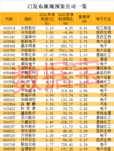 证券时报·数据宝统计显示,目前已有28家公司披露了现金分红预案,近一半公司上市日期距今不足三年。以最新收盘价计算,永新股份、沃华医药、义翘神州、新联电子等4股股息率超过2%。股息率最高的是永新股份,公司年报显示,拟向全体股东每10股派发现金红利5元(含税),股息率约为5.41%。该股今日早间开盘后一度涨近5%,收盘时股价回落至1.32%。