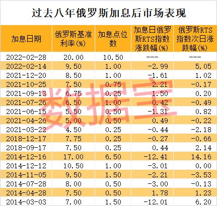 证券时报•数据宝统计,在过去八年时间里,俄罗斯一共加息17次。不含此次加息在内,在过去16次加息过程中,俄罗斯RTS指数加息当天下跌的次数占比六成以上,到了次日俄罗斯RTS指数涨跌的规律就没有那么明显,涨跌的次数各占一半。