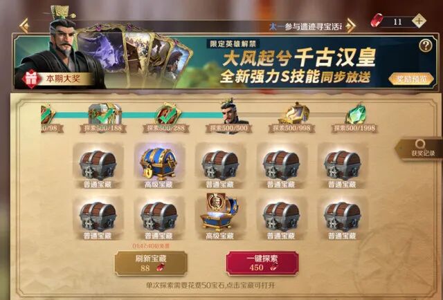 并且除了常驻外,游戏还会上线能够通过探索获得高星角色、技能、道具的“遗迹寻宝活动”,相当于限定池。在限定池中,玩家单次抽卡(探索)需要消耗50宝石(10次450宝石),而这个池子的保底是500抽。