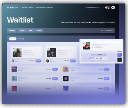 每一天,在平台顶部等候批准名单中的歌曲会被 DAO 批准发布并作为 NFT 销售,而底部的歌曲被 DAO 拒绝并从列表中删除。一旦歌曲获得批准,艺术家将在 Pianity 团队的陪同下确定 NFT 的日期和营销策略。