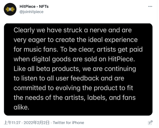 这导致HitPiece最终被迫发表道歉声明,并表示:“当数字商品在HitPiece上销售时,艺术家会得到报酬。”