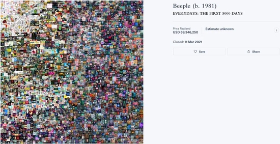 这两年来,我们几乎隔一段时间就能听到NFT艺术品卖出高价的消息,比如去年加密艺术家Beeple的NFT数字艺术品《每一天:前5000天》拍出6934万美元的高价。