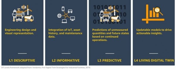 在与客户的讨论中,我们发现市场上存在着广泛的用例需求,而且往往需要配合不同的AWS服务、技术与数据。为了帮助客户们驾驭这一需求,我们开发出一份包含4个层级的数字孪生水平指数:1/描述性,2/信息性,3/预测性,4/活动性。其中第4级-活动性的定义如前文所述。第1级到第3级则适用于复杂程度各异的不同用例,每个用例各自对应自己的商业价值。概括来讲,这套水平指数类似于自动驾驶汽车领域的L0-L5分级,其中L0代表纯手动驾驶、L1为自适应巡航,而L5则是无需旗舰的纯自动驾驶。作为客户,您可以将自己的用例与适用的级别匹配起来,借此理解有助于加速业务价值与未来份额增长的特定服务及应用模式。