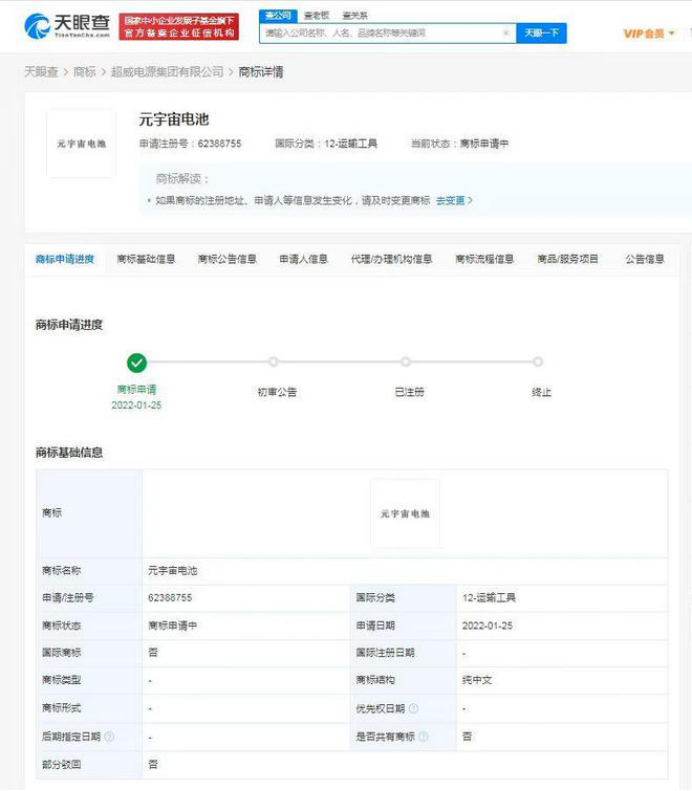 近日,天眼查App显示,超威电源集团有限公司申请注册“元宇宙电池”“超威元宇宙”“原力元宇宙”等多个元宇宙相关商标,国际分类涉及科学仪器、运输工具等。目前,这些商标状态显示为申请中或等待实质审查。(天眼查)