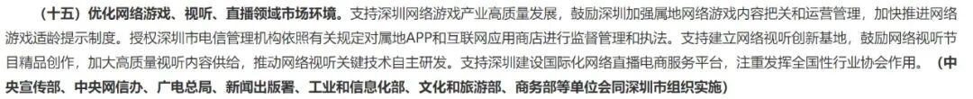 【国家发改委:支持深圳网游高质量发展】国家发改委、商务部发布《关于深圳建设中国特色社会主义先行示范区放宽市场准入若干特别措施的意见》,其中在15条指出,优化网络游戏、视听、直播领域市场环境。支持深圳网络游戏产业高质量发展,鼓励深圳加强属地网络游戏内容把关和运营管理,加快推进网络游戏适龄提示制度。授权深圳市电信管理机构依照有关规定对属地APP和互联网应用商店进行监督管理和执法等。