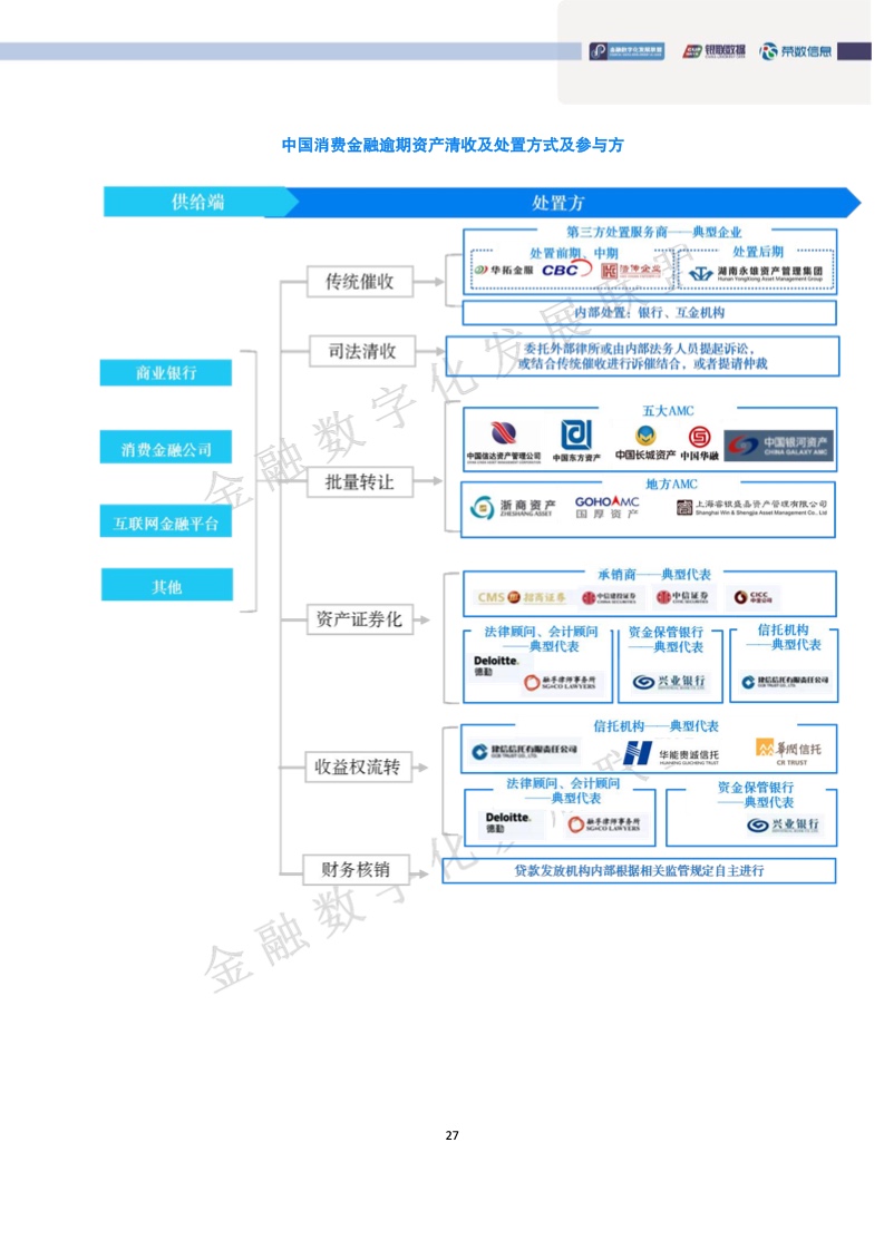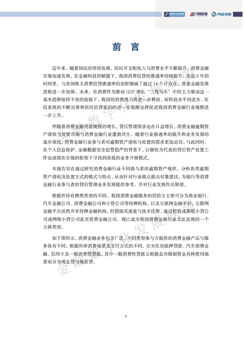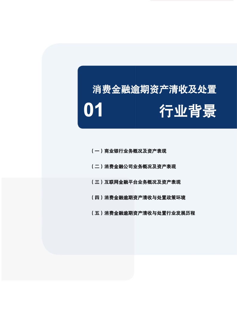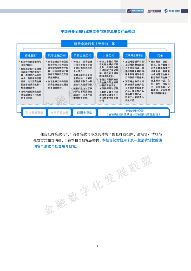 《报告》对信用卡及一般消费贷款的逾期资产清收与处置展开研究,主要从商业银行、消费金融公司、互联网金融平台三大类行业参与者的业务概况与资产表现作出分析。