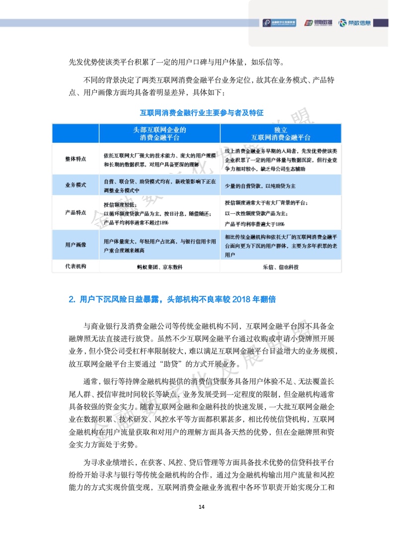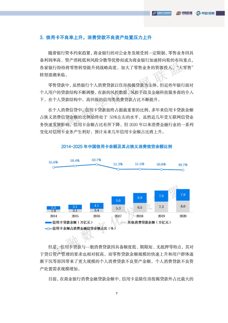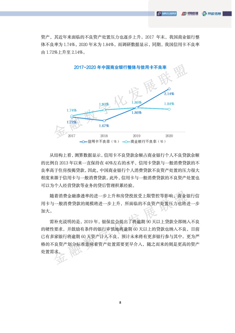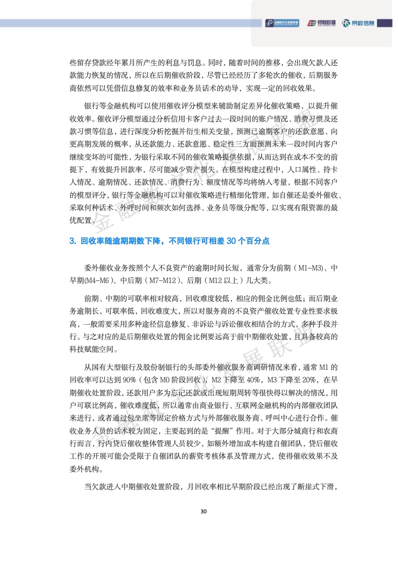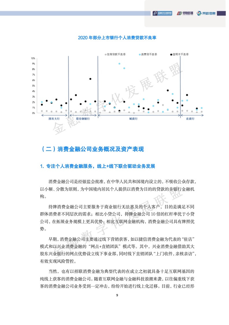 《报告》对信用卡及一般消费贷款的逾期资产清收与处置展开研究,主要从商业银行、消费金融公司、互联网金融平台三大类行业参与者的业务概况与资产表现作出分析。