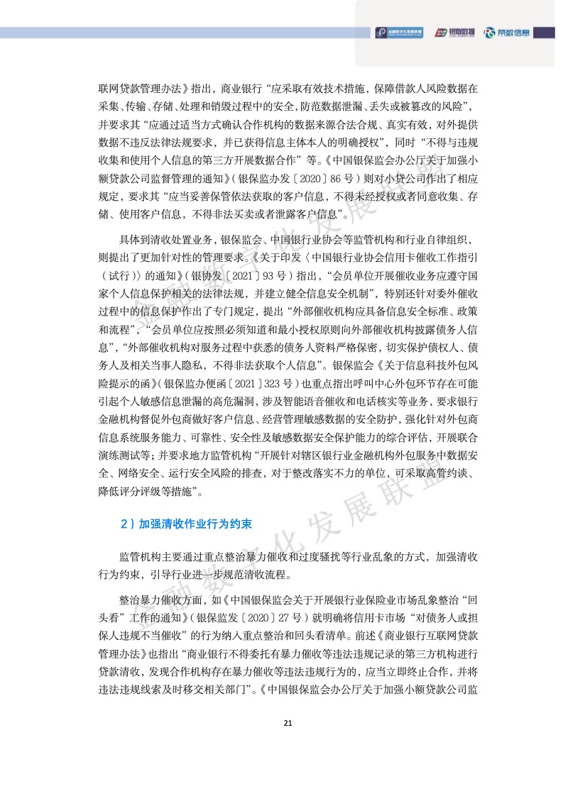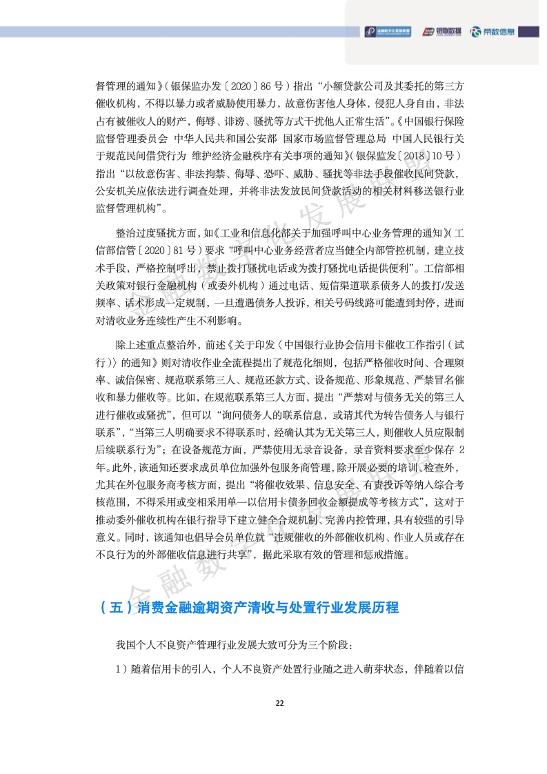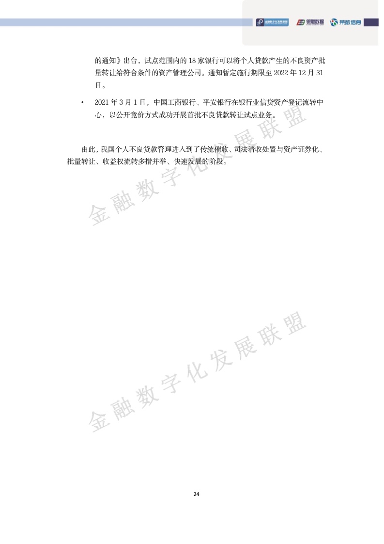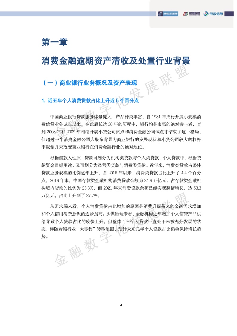 金融数字化发展联盟联合银联数据、荣数信息发布了《中国消费金融逾期资产清收及处置专题报告》,该报告包括四个章节,通过九十多页、近五万字的详实分析,介绍了消费金融行业不同参与者的逾期资产现状、分析各类逾期资产清收及处置方式的模式与特点,从而针对行业痛点提出对策建议,为银行等消费金融行业参与者的贷后管理业务发展提供参考,并对行业发展做出展望。
