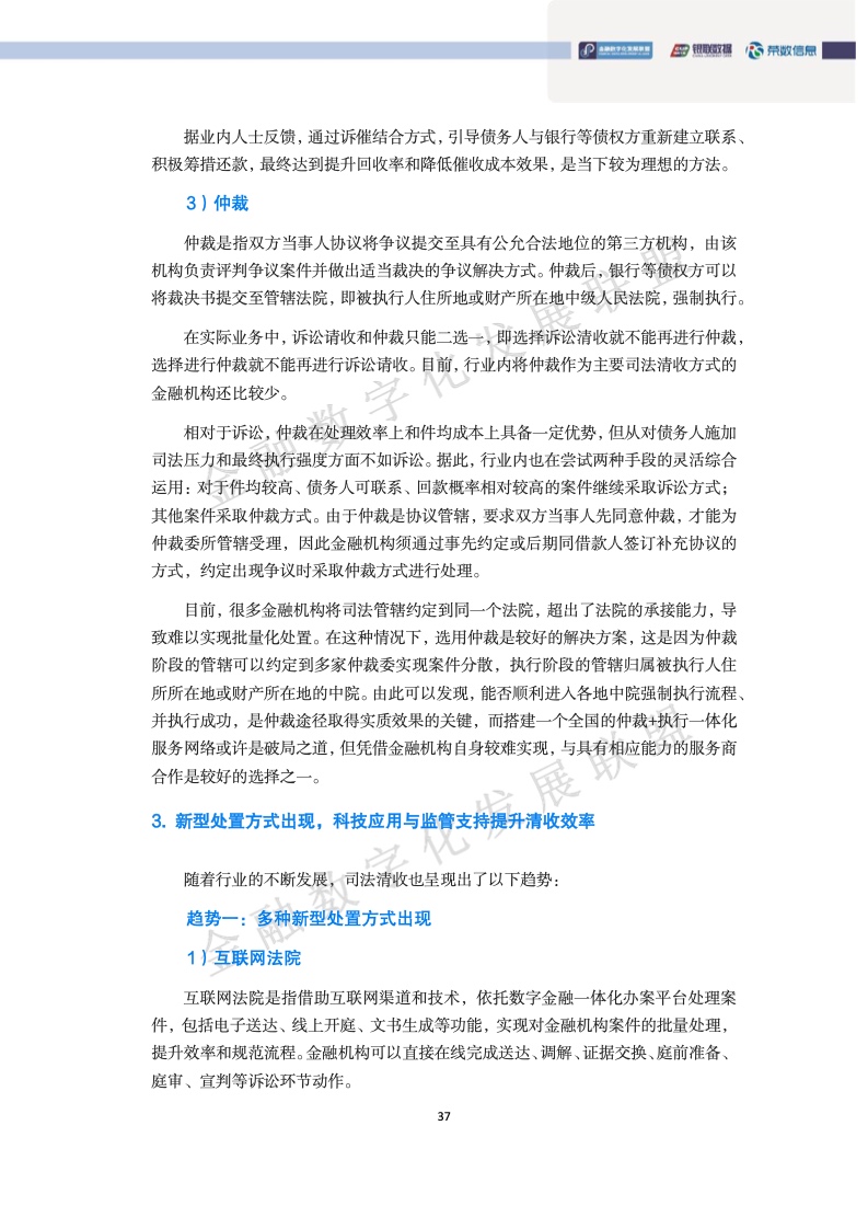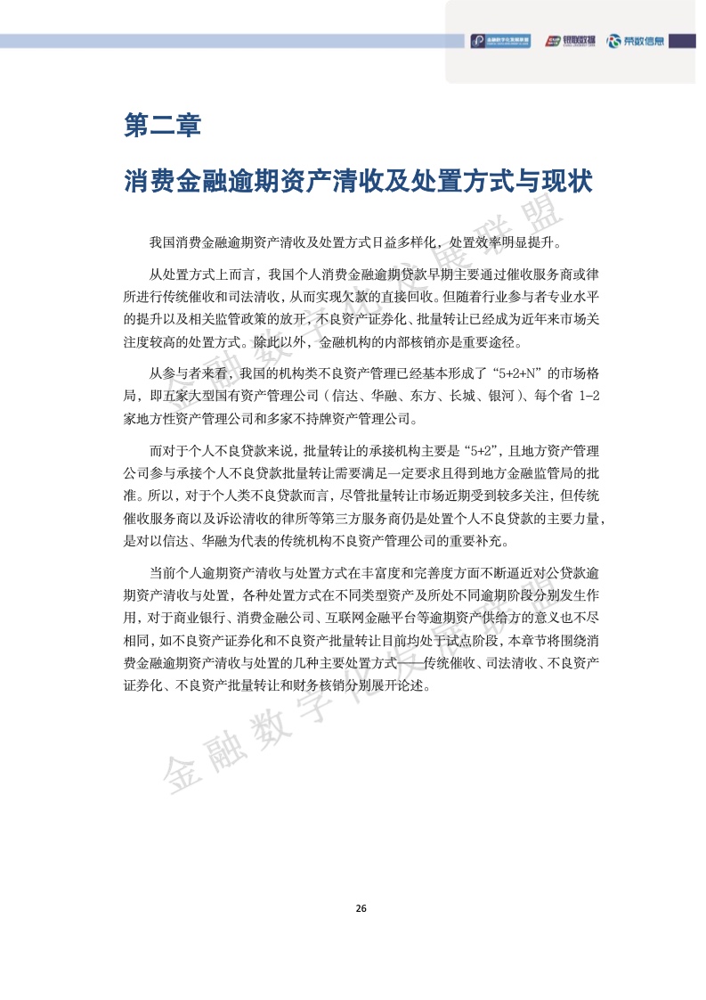 《报告》主要对传统催收、司法催收、批量转让、资产证券化、收益权流转与财务核销展开分析。其中,传统催收和司法催收是早期行业普遍采取的处置方式。近年来,批量转让、资产证券化的关注度显著提升。