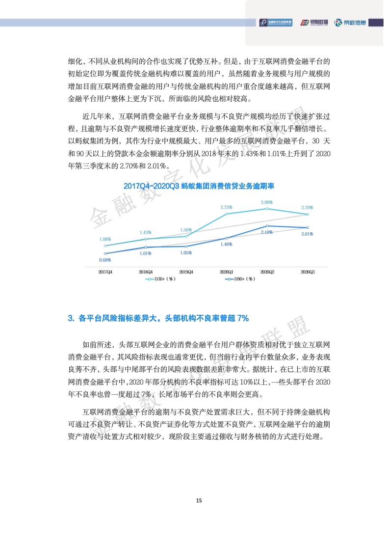 商业银行是我国贷款服务最大供给主体,近五年个人消费贷款占比上升20%,贷款规模的上升同时也带来了不良资产的增长,信用卡与一般消费贷款的贷后管理需求持续攀升,不良资产处置压力加大;持牌消费金融公司主要服务于银行无法惠及的个人客户,具有小额性、分散性。总体来看,其风险表现高于信用卡;相较传统金融机构,互联网金融平台用户整体更为下沉,所面临的风险也相对较高。伴随着业务规模快速扩张,逾期与不良资产规模增长速度更快,行业整体逾期率和不良率几乎翻倍增长。某头部平台30天和90天以上的余额逾期率分别从2018年末的1.43%和1.01%上升到了2020年第三季度末的2.70%和2.01%。行业内平台数量众多,头部与中尾部平台的风险表现数据差距非常大。