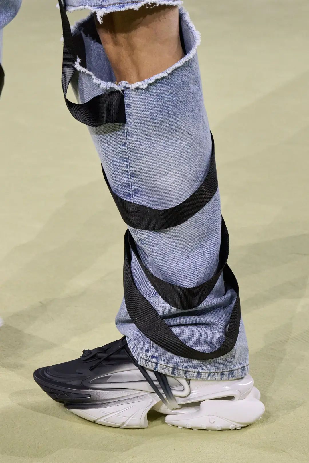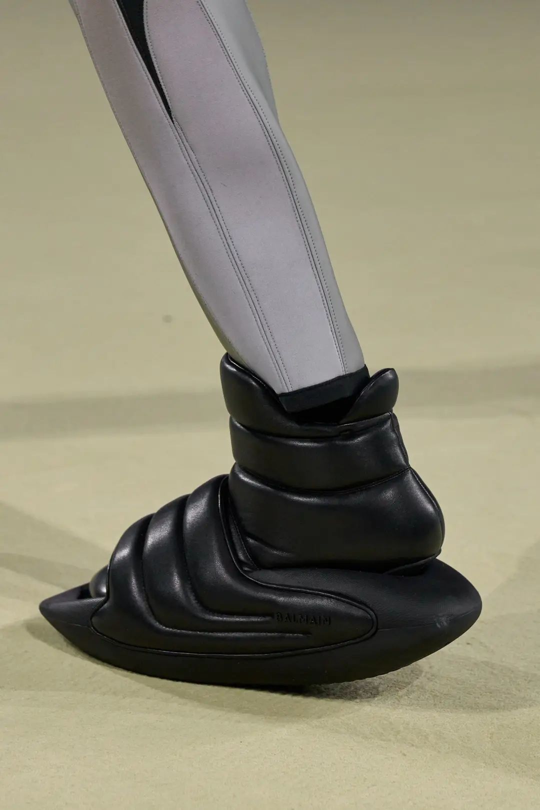 在Balmain今年的秋冬秀场上,我们可以看到去年的“异形”云朵拖鞋再次出现,除此之外,外形设计更加夸张的球鞋也出现在此次秀场之中。