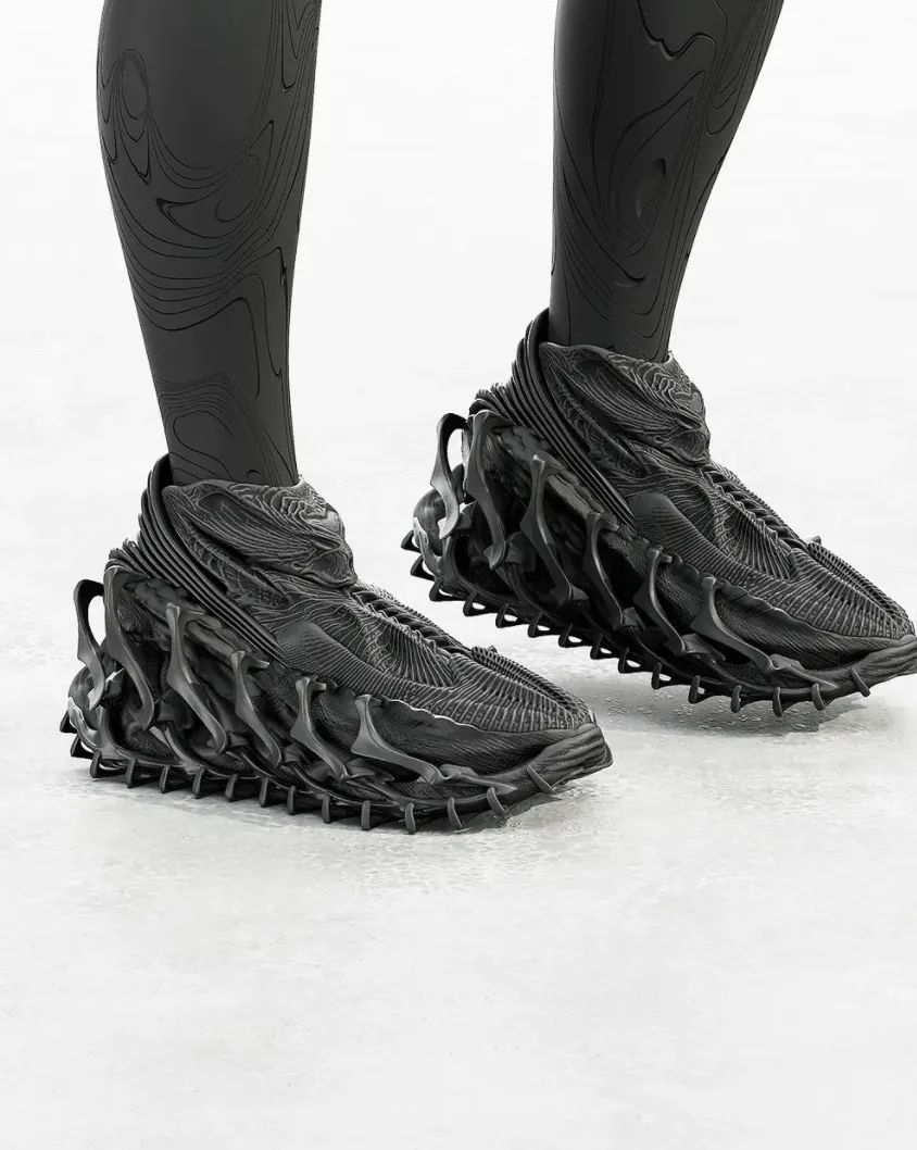 与Heliot Emil的设计风格不谋而合,SCRY™️ Lab同样是以未来主义的鞋款设计见长。但相较于设计师Safa Sahin以平面设计为主不同,SCRY™️ Lab则是完全基于3D打印技术、在“数字胚胎”框架下来完成草图设计与建模渲染,让它们得以在现实中呈现出来。