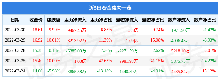资金流向数据方面,当日主力资金净流入9467.45万元,游资资金净流入1.35亿元,散户资金净流出1971.5万元。近5日资金流向一览见下表:
