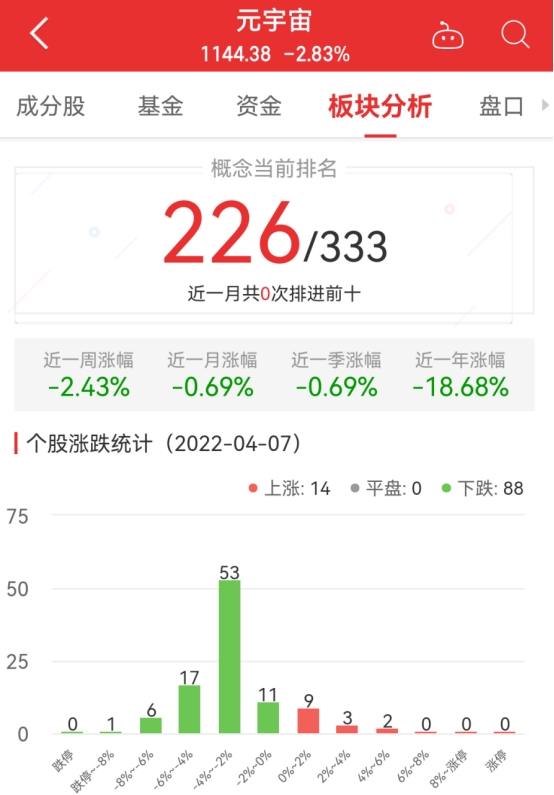 中国经济网北京4月7日讯 今日,元宇宙板块整体跌幅2.83%,其中14只股票上涨,0只股票平盘,88只股票下跌。