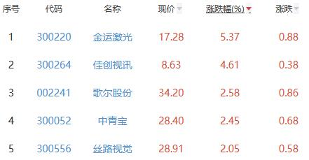 其中,金运激光、佳创视讯、歌尔股份、中青宝、丝路视觉位列板块涨幅前五位,涨幅分别为5.37%、4.61%、2.58%、2.45%、2.05%。