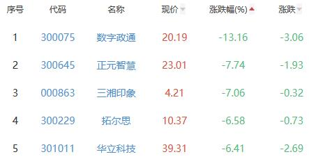 数字政通、正元智慧、三湘印象、拓尔思、华立科技位列涨幅榜后五位,涨幅分别为-13.16%、-7.74%、-7.06%、-6.58%、-6.41%。