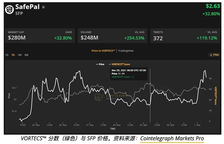 如上图所示,SFP的VORTECS?得分在11月29日飙升至绿色区域,并在41小时左右创下81的高点,然后价格在第二天增长了38%。