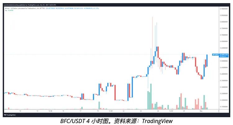 来自Cointelegraph Markets Pro和TradingView的数据显示,在12月1日早期交易时段创下0.35美元的低点后,BFC的价格飙升56.84%,达到0.556美元的盘中高点,因为其24小时交易量超过了1.3亿美元。