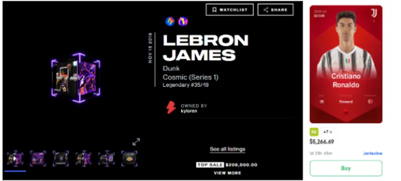 然后,这些卡片可以被持有,押注于未来会不断升值,或在游戏或挑战中使用来赢得奖励。卡片根据存在的数量有不同的稀有性价值。越是稀有就越有价值,或者在游戏中的效用就越大。NBA Top Shot(篮球)和 Sorare(足球)是至今为止最受欢迎的两个平台。