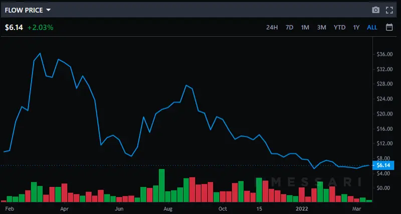Sorare 在以太坊上运行。因此,除非你是一个风险投资者,否则你没有直接的渠道来接触该平台。Dapper 的产品在 Flow 区块链上运行,这让用户有机会接触到其生态系统中的所有产品。随着 Top Shot 的升温,Flow 代币在 2021 年有一个令人印象深刻的上涨,但随着生态系统的稳定,其代币价格也急剧下降。