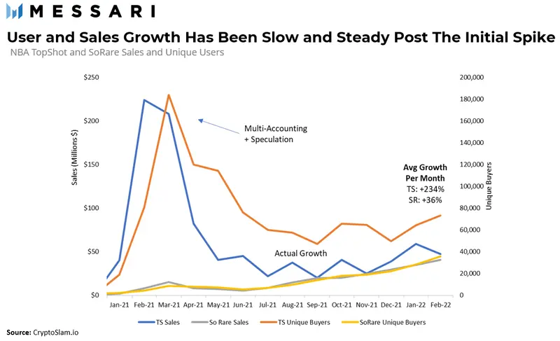 Sorare 和 Top Shot 只存在了几年的时间。它们的推广是经过衡量的,到目前为止它们投入了有限的营销。到目前为止,Sorare 和 Top Shot 的采用是有机的,因此整个采用是相当缓慢和稳定的。Top Shot 最初的流行主要是由于投机,但总的来说,这两个最古老的平台已经以渐进的速度升值。Top Shot 仍然正式处于测试阶段。