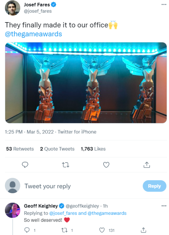 今日《双人成行》制作人,暴躁老哥Josef Fares在推特上晒出了TGA的三座奖杯。并表示:“他们可算把这些奖杯送到我们的办公室里来了。”TGA 创始人Geoff Keighley也在下面评论:“你们值得这些奖项!”
