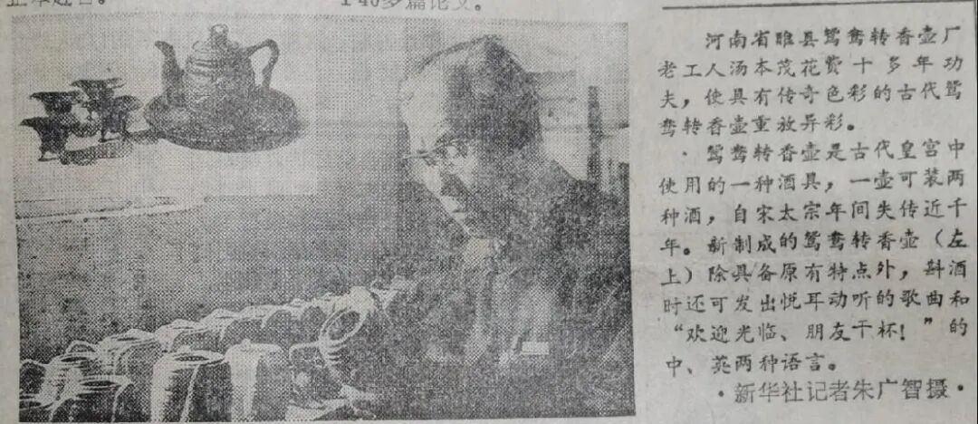 1988年前后,一名河南睢县的工人汤本茂因为一个发明被大肆报道,他手中被媒体称为“神壶”的鸳鸯转香壶正是失传已久的阴阳壶。
