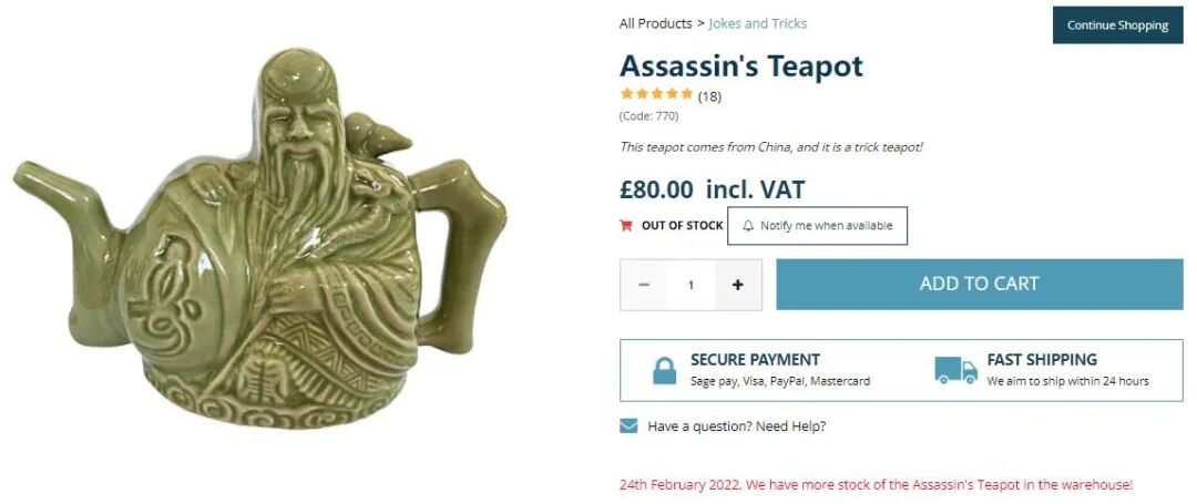 在某个相关视频下,有网站贴出了同款酒壶的购买链接,即使单价高达70英镑,依然被迅速抢购一空。二月底他们再次补货并涨价到80英镑后,同样卖到脱销缺货至今。而在国内的某宝上,同款寿星版阴阳壶最低只要58元就能买到,价格只有它们的十分之一。