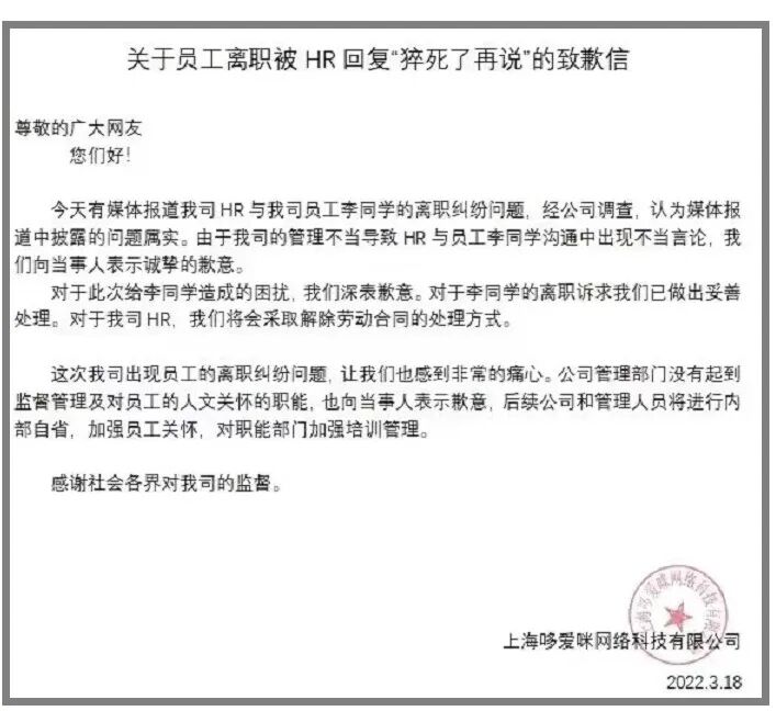 【“猝死了再说”所在公司发道歉信】 某游戏公司员工离职被HR回应“猝死了再说”引发热议,事后多位网友在此公司TapTap论坛进行了吐槽,目前此公司已发布道歉信,表示会妥善处理当事人离职诉求,对涉事HR解除劳动合同。