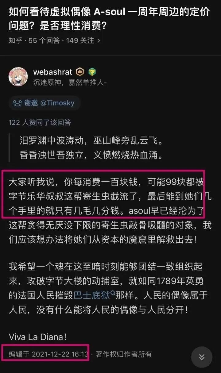 而在知乎“如何看待虚拟偶像A-Soul官宣珈乐「直播休眠」?”的问题下方,截止发稿已经产生了1000多个回答,400多万次的浏览。一则高赞回答这样说道: