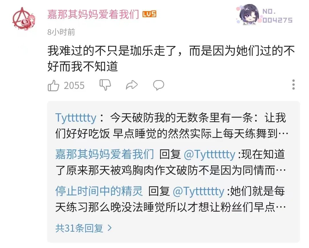 从知道珈乐中之人境遇的那一刻起,我就只希望让这个企划赶紧炸成一朵烟花。我不知道她能熬多久,不知道这个构筑于姑娘们血泪之上幻梦什么时候崩塌,我只能用手头的几个小号翻来覆去复读一些话来鼓励她。