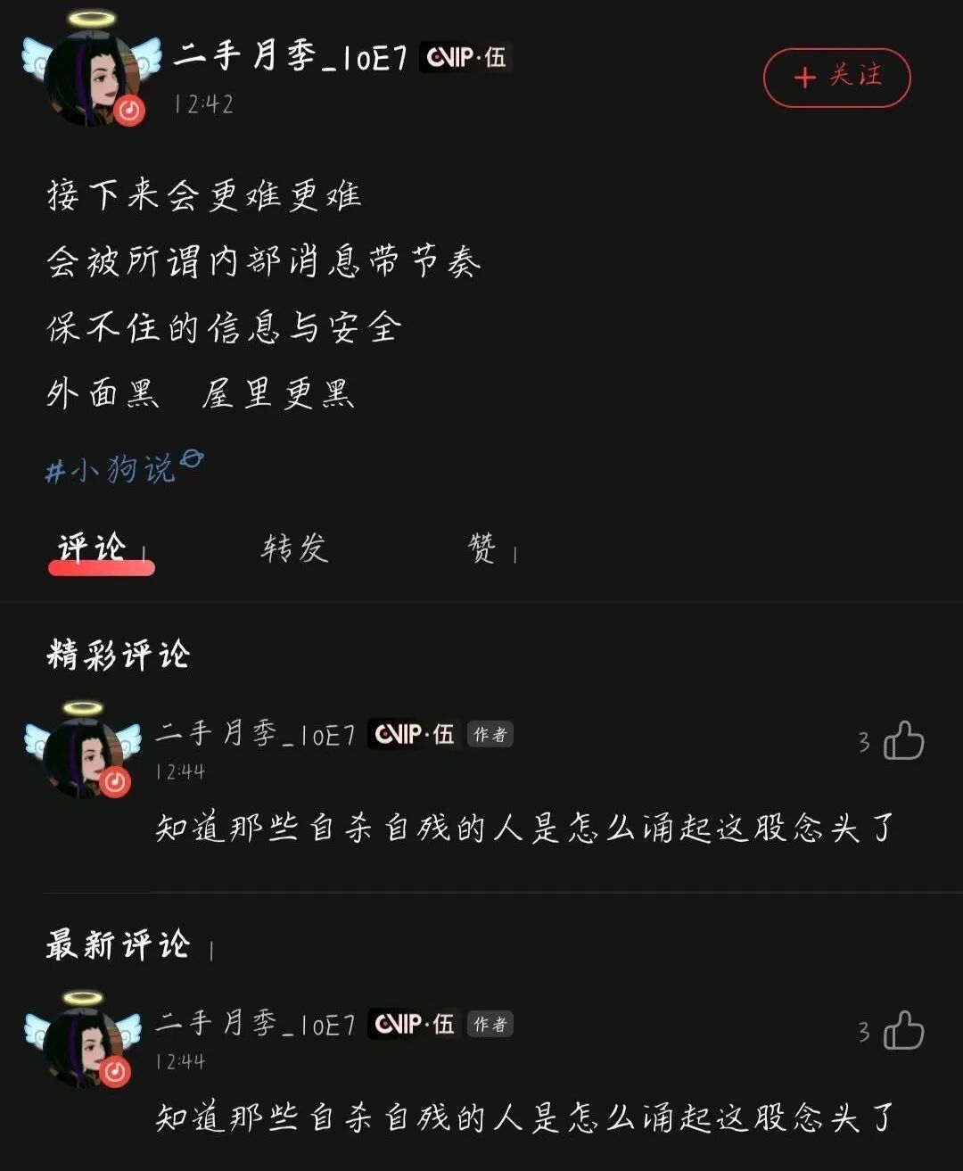 当她的一些账号甚至出现了自杀相关的字眼时,我无比担心哪天会出一纸讣告,但真的很对不起,我也只是个什么都做不到的普通粉丝,只能盼望着渺茫的希望让这一切结束。
