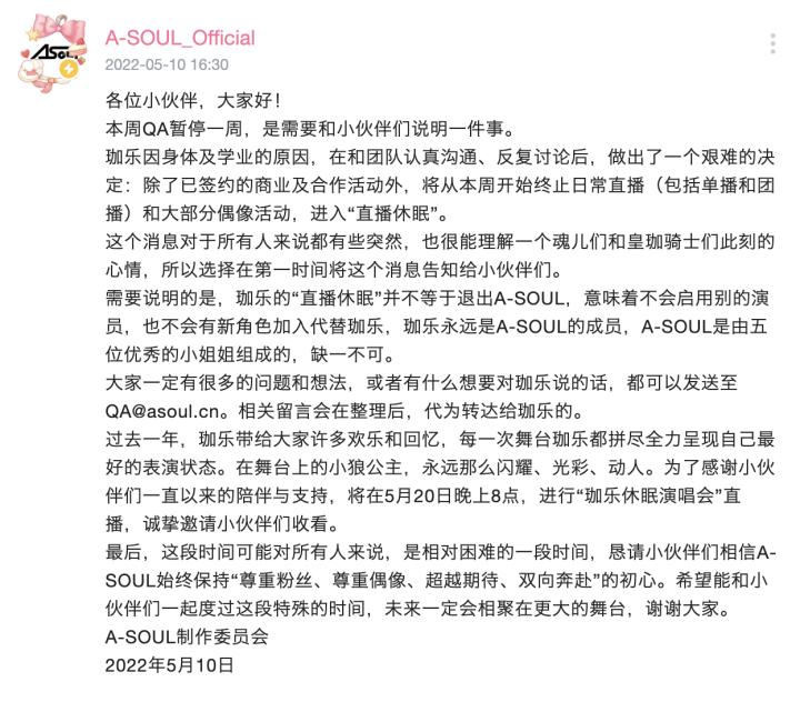 5月10日下午,国内顶流虚拟偶像团体A-Soul的B站官方发文,宣布了成员珈乐「直播休眠」的决定――这是A-Soul成团之后第一次人员变动。