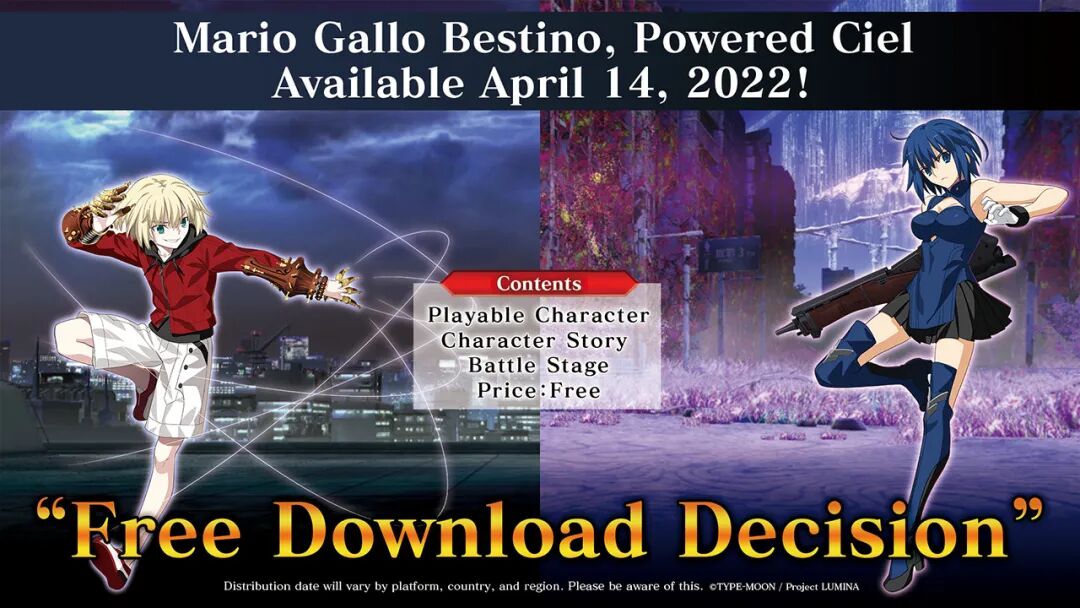 《月姬格斗:TYPE LUMINA》将于4月14日推出免费DLC,追加两名新角色“完全武装希耶尔”、“马里奥·贾洛·贝斯提诺”,以及两名角色的对应故事和两个新的战斗场地。此外,这两名角色对应的回合报幕语音也将作为付费DLC同步上线。