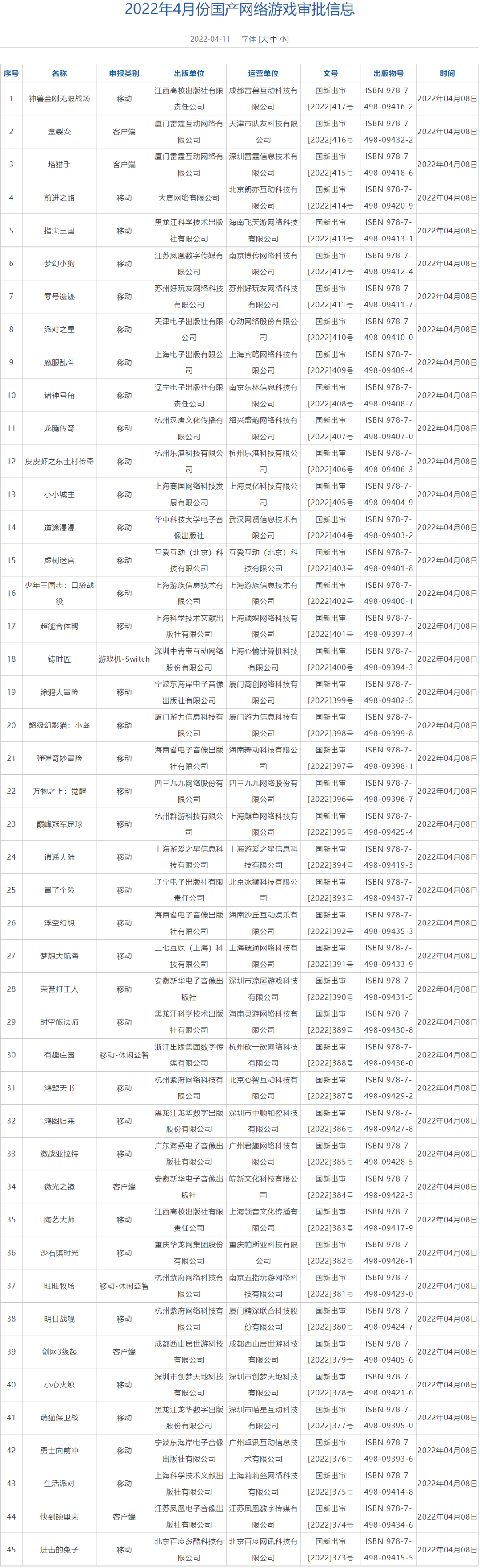 国产网络游戏4月份最新版号正式公布,这也是继去年7月份版号停发以来时隔263天的重启。本次共有45款游戏获得版号,其中包括国行NS游戏《铸时匠》。