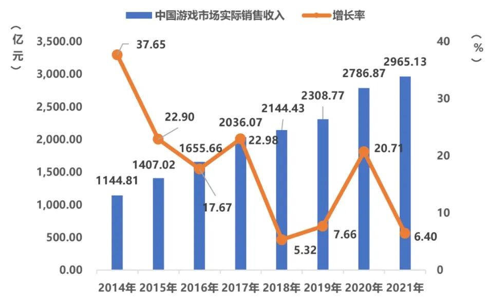 相似的情况,在2021年几乎重演。2021年中国游戏行业销售增长率仅为6.4%,一年前,这一数据为20.71%,差距巨大。