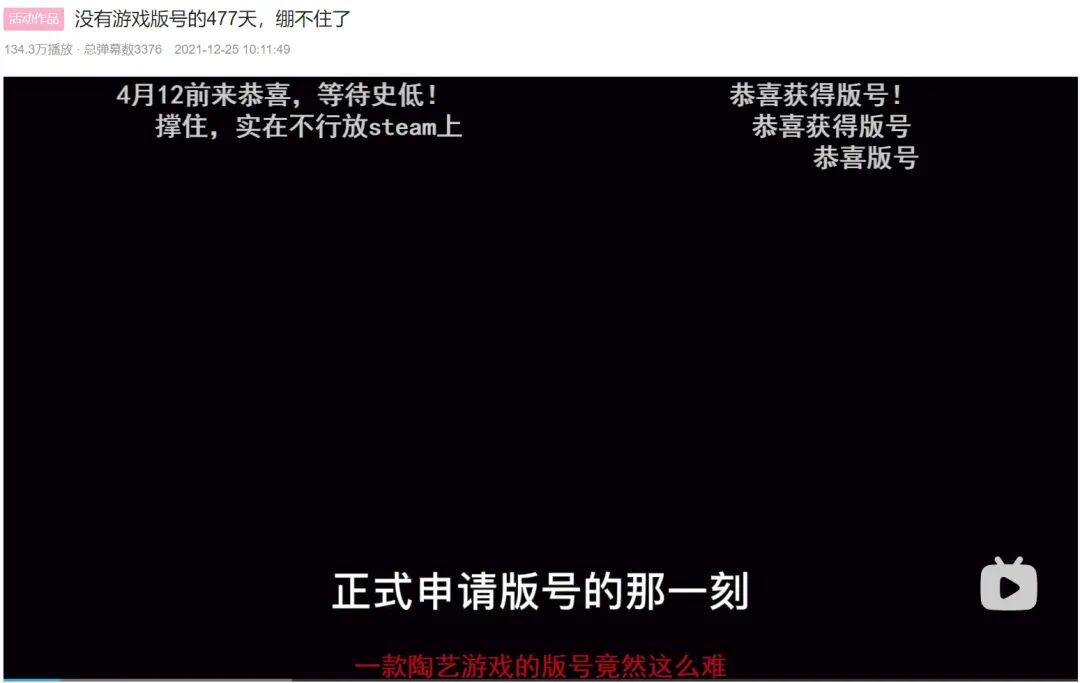而那款申请版号长达两年时间的独立游戏《陶艺大师》,已经在Steam平台重新上架,正常售卖。《陶艺大师》的制作人AZGames,第一时间宣布《陶艺大师》移动版将于一个月内登陆TapTap。这款广受玩家期待的游戏,终于等来了与国内玩家见面的时刻。B站上,AZGames去年年底发布的视频《没有游戏版号的477天,绷不住了》,正在被不少观众考古,大家对AZGames送上了由衷的祝福――“恭喜获得版号!”