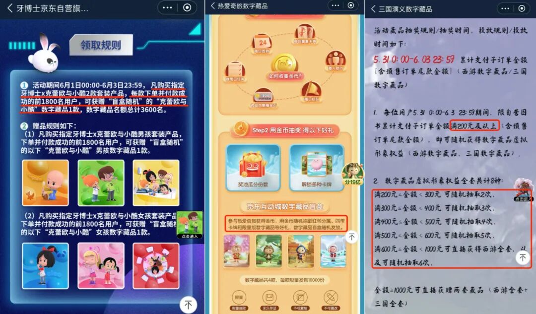 除了和单独的品牌、IP等联合推出数字藏品,数字藏品这一形式和平台活动也结合得较为频繁,如“618京东超级互动城数字藏品”,通过做任务,得金币,然后抽取数字藏品;京东图书发行的《漫画三国》系列数字藏品,获得的最低门槛为固定时间内自营图书累计支付子订单金额满200元及以上,而未限定在某一品牌产品。从整体的发行频率来看,似乎也随平台的销售活动、计划变动,如6月有儿童节,还有618购物节,发布的藏品数量也相对较多。
